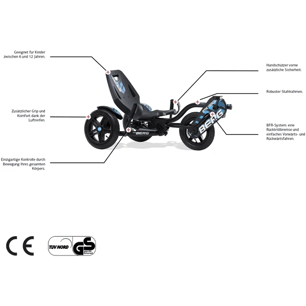 Ben je op zoek naar een compleet andere, coole Pedal skelter? Dan is de BERG Street-X iets voor jou! U bestuurt dit unieke voertuig niet met uw armen of handen, maar door uw hele lichaam te bewegen. Net als op een motorfiets. De luchtbanden van de Street-X bieden optimaal rijcomfort. Dankzij de geïntegreerde BFR-naaf pedaal je moeiteloos naar Pedal e.