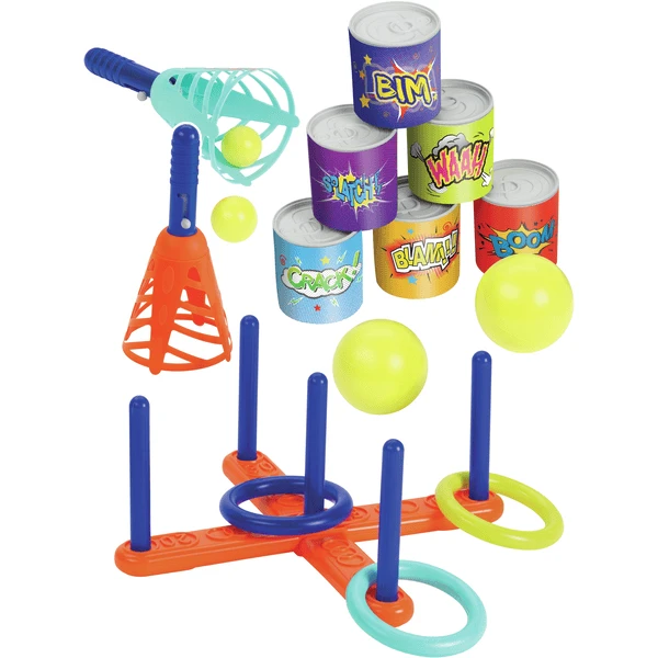 Bestaande uit een blikkenwerpset met 6 blikken en 2 ballen, een werpspel met 4 ringen, een balwerpspel met 2 kokertjes en 2 ballen. Bij alle spellen staan het plezier van bewegen en de bevordering van de behendigheid op de voorgrond. Ideaal voor het strand of de tuin – gemakkelijk te vervoeren door het geringe gewicht.