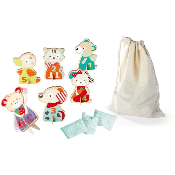 - Set bestaat uit: 6 speelfiguren, 3 werpzakken en tas voor opslag