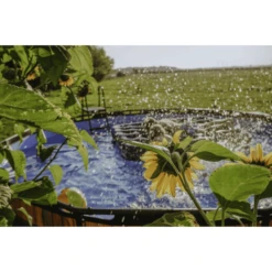 Het zwembad is standaard uitgerust met een filterpomp en valt op tussen andere zwembaden door zijn grote houten patroon.