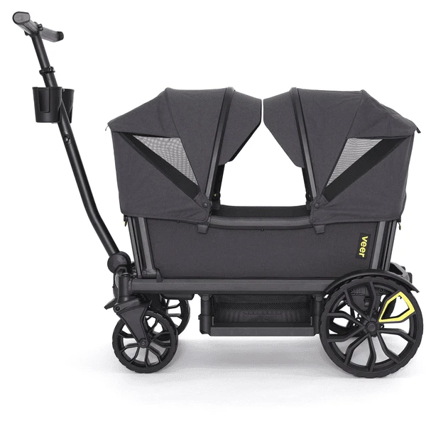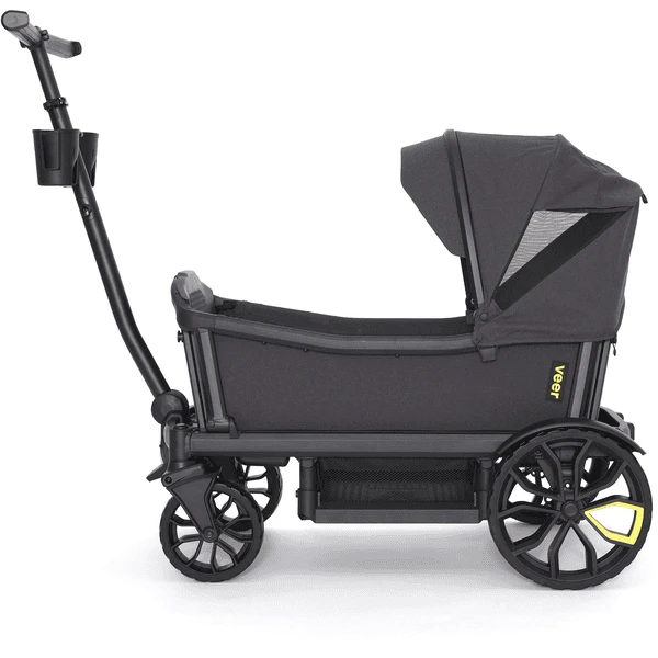 De Veerse zonneklep in combinatie met twee luifels biedt bijna volledige bescherming tegen de zon, terwijl de kleine passagiers toch uitzicht hebben op hun omgeving.